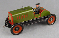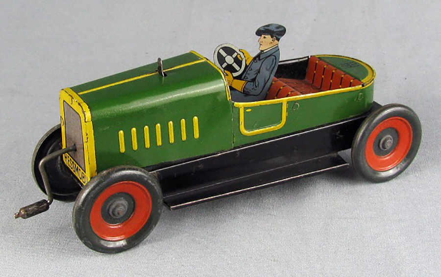 | Hessmobil 1051 roadster, circa early 1930s L 7” (17.8 cm), W 2.5” (6.4 cm), H 3.5” (8.9 cm) Hessmobil roadster, marked “1051”, “JLH” logo “D.R.R.”, “D.R.G.M.” and “Hessmobil”. Cranked flywheel power with front wheel drive. |