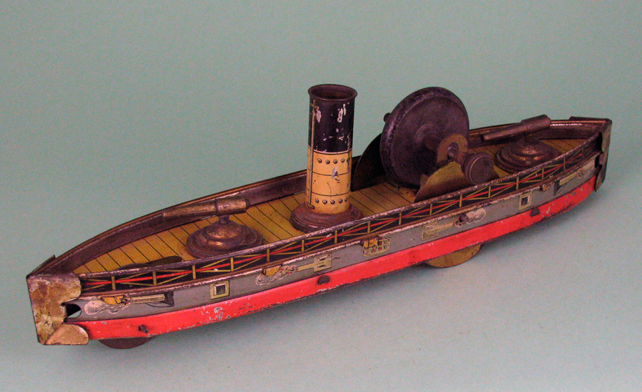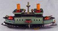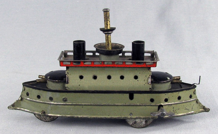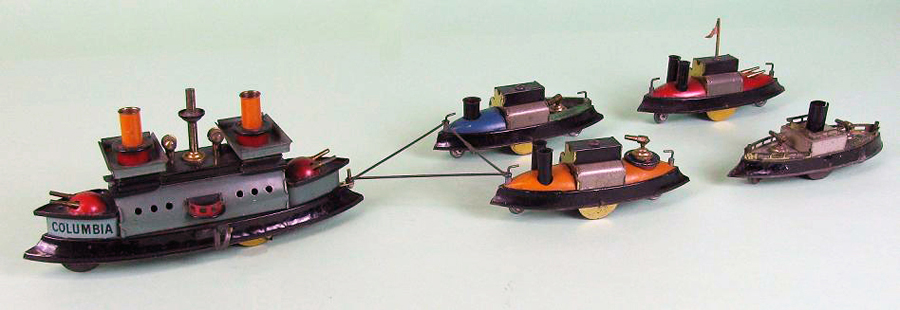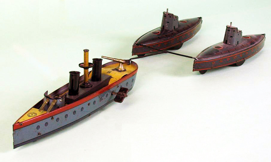 | Hess early battleships, circa 1890s – 1910 L 8.25” (21 cm), W 2.06” (5.2 cm), H 3.88” (9.8 cm) Measurements are without flags or key and depends on how model is equipped. Many different variations exist with these battleships over their production life. Shown are a few in my collection. One can usually chronologically date the production by variations in order by the simplification of mechanics or graphics. An example is the design and manufacture of the cannons. Early manufacture used multi-part cylindrical gun turrets while later manufacture used a simpler, but still multi-part, spherical gun turret, and the last manufactured model used a single piece cast metal cannon. Although most of these battleships were not named, Hess produced some of these models with a variety of names which included “Dreadnaught, Columbia, Deutchland, Made in Germany, Libertad, Liberte, Oscar II, Jeanne’Darc” and others, depending on country of export. All were equipped with clockwork, wound by a permanent key. Some were designed to be sold individually as they were not equipped with a towbar, while others sold with a towbar (and in a set) pulled 2 to 6 smaller following vessels connected with tinplate (early models) or formed wire connectors. An instruction sheet showing suggested towing configurations was included with the toy. The largest set I have observed has been a two battleship set, each with 6 following vessels. All battleships were sold with detachable flags, but these appear to have been the first parts lost in playwear for many sets. |