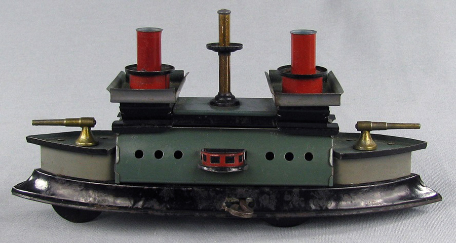 | Variation 1 Probably the earliest version of this battleship, it features prominent inverted bow and stern, single part hull / body, large cylindrical multi-part gun turrets, cast metal key. |