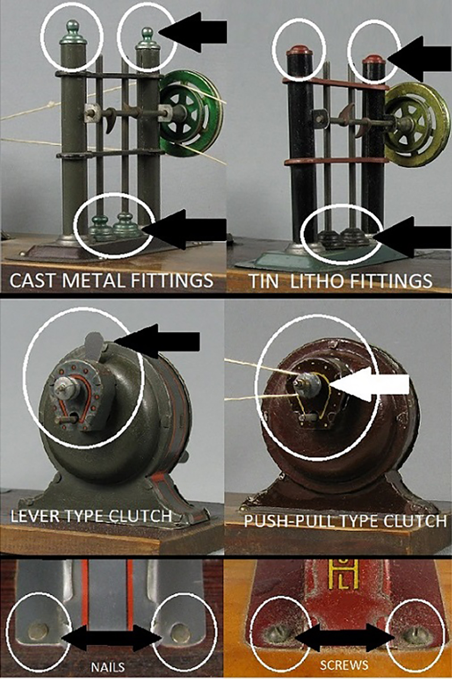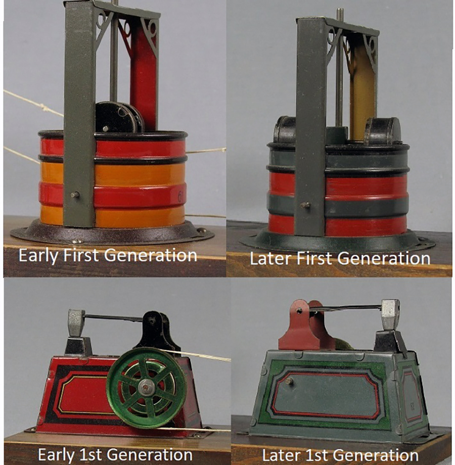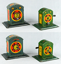 | Dynamobil 1st Generation Changes (large size) There are many small and subtle changes within the first generation of Dynamobils. Here are some noticeable differences: Early models use screws for both motors and accessories to fasten to board; later models use nails. Early model twin drop hammer used cast metal hammerheads and finials; later models use lithographed tinplate. Early model rotating mills used orange and red litho; later models used gray and red. Early model trip hammers were in red litho; later models use gray litho. Early motors used a combination of litho and paint in maroon red; Later models were all litho in red, then in gray. Early motors used a push-pull type clutch to engage motor with accessories; later models used a lever type clutch. |