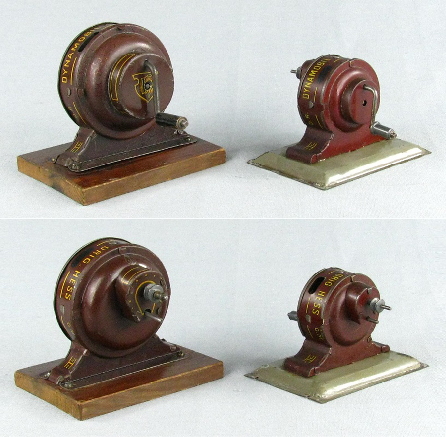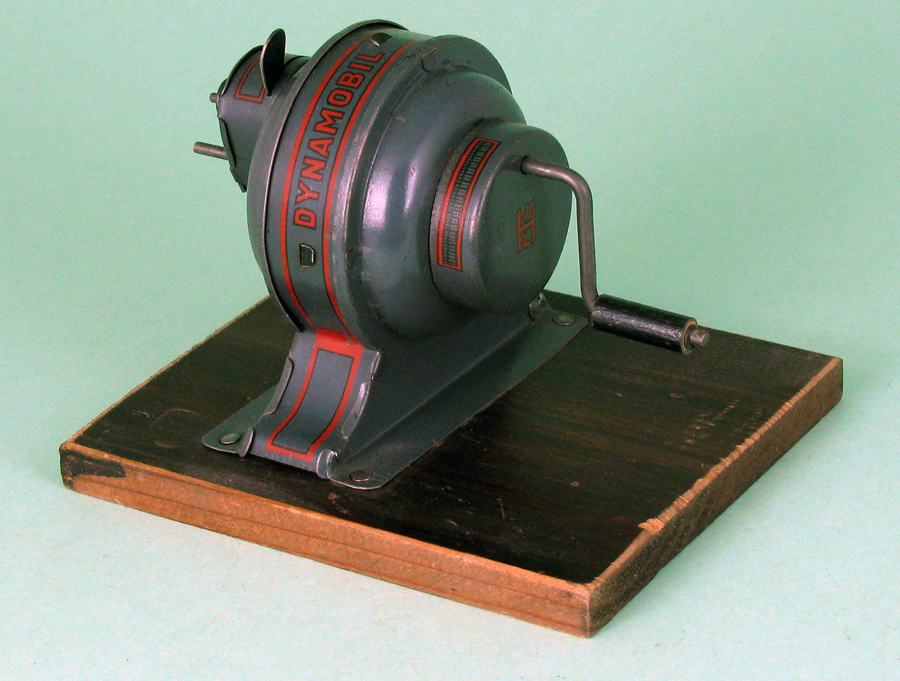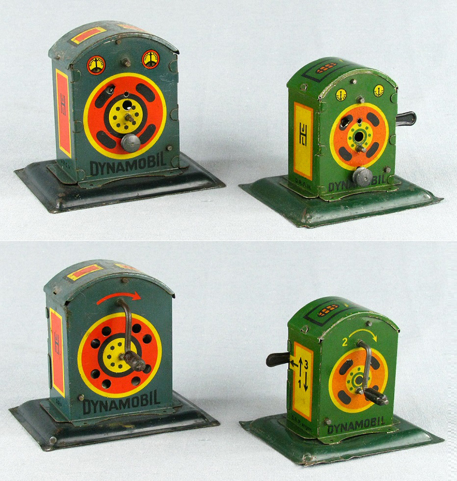 | Dynamobil 3rd Generation, Small and Large Models, circa late 1920s to early 1930s The third generation Dynamobil had new graphics outside plus a slightly changed shape, but the big change was the inside mechanics. First and second generation Dynamobils could be cranked in both clockwise / counterclockwise directions, however the accessories would only function when cranking in a clockwise direction. The third generation solved this problem by only allowing clockwise cranking. Previous generation Dynamobils also had a problem with gears stripping when too much pressure was applied when cranking. The new mechanics acted more in a synchronized manner which greatly helped with gear stripping. These new mechanics were also carried over to the flywheel powered Hessmobils of the period.