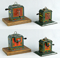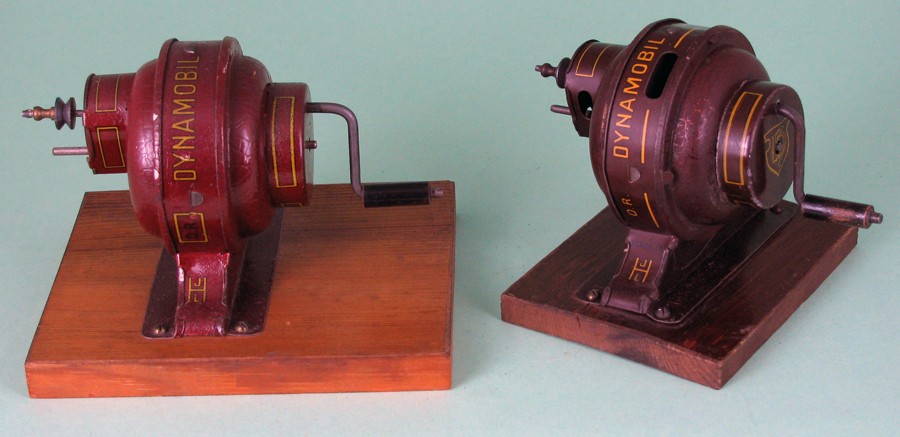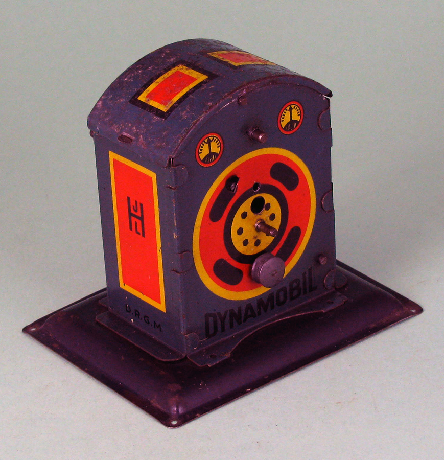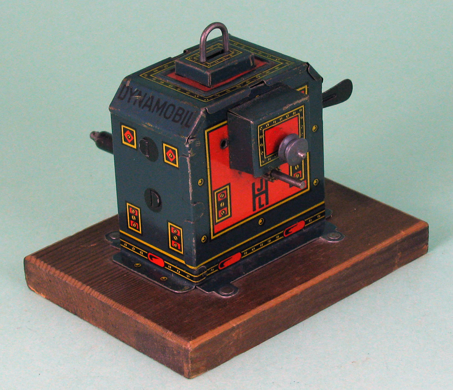 | Dynamobil 2nd Generation, Small and Large Models, circa 1920s The newly designed second generation Dynamobil had its exterior shape and graphics modernized with bright color and a new more industrial shape. These were produced in two different sizes, with shape and graphics being almost identical. |