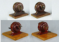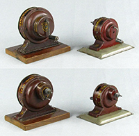 | Dynamobil, 1st Generation large size, circa late 1890s – early 1900s Shown are two of the first generation Dynamobil motors. These featured cranked flywheels for momentum to drive accessory workshop tools. The dark red example at top is the earliest noted by oiling holes and a smaller wooden base. The brighter red example is a little later production as oiling holes have been removed. Both examples are equipped with push-pull type clutch devices to start and stop the pulley from engaging the flywheel drive. Both of these pieces utilize lithography and painting to decorate. Dark red example is marked “Dynamobil”, “Orig. Hess”, “D.R.G.M.”, “JLH” logo and “H” shield logo. The brighter red model is marked “Dynamobil”, “Pat. Hess”, “JLH” logo and “H” shield logo. These early models used screws to fasten the motor to base with later models using nails. |