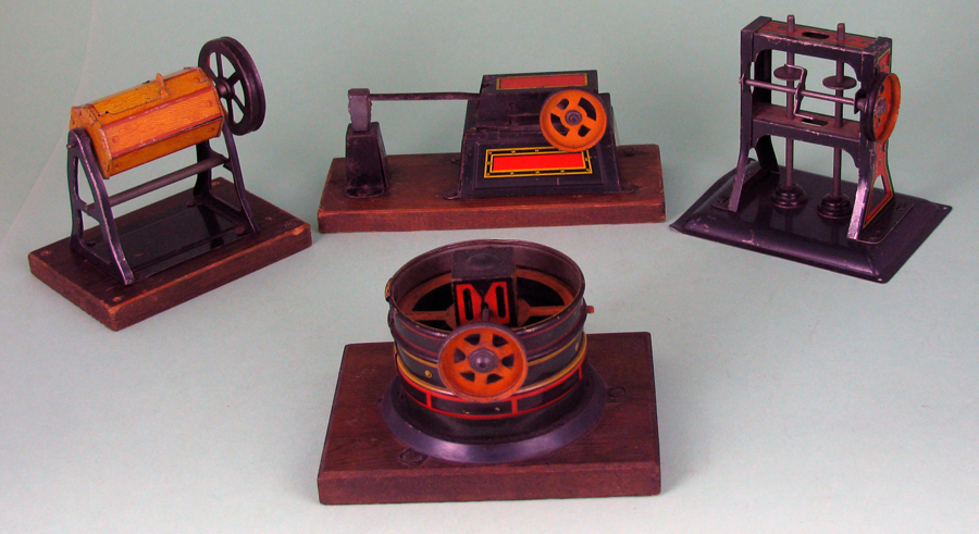 | Three small size first generation Dynamobils with two accessories. The back example is mounted on a tinplate base. The middle example is a typical production piece and the front sample has some of the dullest decoration of the accessories. I would guess that the factory was experimenting or had a shortage of materials with which to lithograph. | ||||