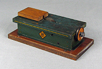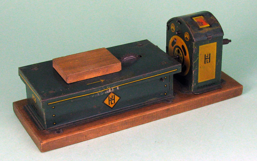 | Hess Dynamobil Table Saw Accessory Base: L 7.06” (17.9 cm), W 3.44” (8.7 cm), H 2.38” (6 cm) Marked: “D.G.R.M.”, “D.R.P. angem.”, “96”, “JLH” logo This table saw accessory was available with a wooden base and without any base. It is generally seen with the Dynamobil motor attached and although offered in the Hess catalog as a separate accessory, it is extremely hard to find by itself. When operating, the pulley freewheels until the lumber is pushed into the sawblade. Of note are the two pulleys of the main drive; one small, one large.