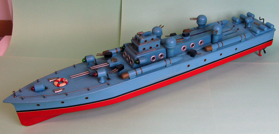 | An ITO, Japanese postwar produced wooden torpedo boat, 36” long with working lights and twin engines. | ||||