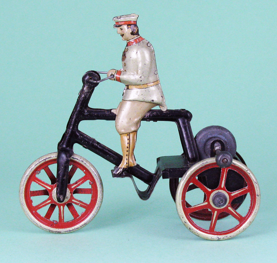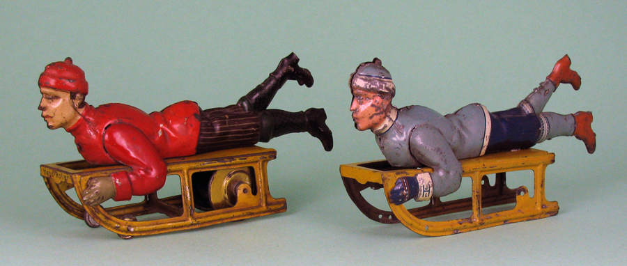 | Two examples of the Hess figural boy on sled. One without wheels, the other as a windup. It was not unusual for Hess to make 2 or 3 different powered versions of their toys. Simple rollers, flywheel friction powered and clockwork. These examples unnamed or numbered but do have the JLH loco printed on the boy’s jacket cuff. | ||||