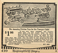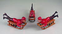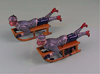 | Several examples of the Hess figural boy on sled named “Kismet”. JLH logo is printed on the underside of sled. Flywheel friction powered. | ||||