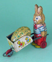 Rabbit pushing cart with easter egg by Chein. |