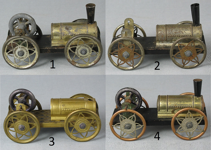 | Hess Prelitho Loco Variations, circa 1880s Hess seems to have constantly been making changes to their product, especially in the early days of mass prelitho production. Shown are four of the same style locomotive, all different in some way. Number 3 is the most unusual of the four locomotives, mostly made from brass; brass single part wheels, boiler and an unusual diamond diecut floorplate over tinplate. Stamped on the wheel rims: “Deutsches Reichspatent” and “No. 44408”. Number 1 is all tinplate construction with single part wheels and stamped in the wheel center is “Deutsches Reichspatent”, “No. 44408”. Number 4 is all tinplate construction with complicated multi-part wheels, marked “D.R. Patent” and “Made in Germany” in the wheel centers. Number 2 is mostly tinplate construction with brass inserts in the multi-part wheels, marked “D.R. Patent” and “No. 36181”. |