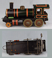 | Mohr & Kraus cranked flywheel locomotive, circa 1920s L 8.63” (22 cm) w/o wire loop, W 3.25” (8.3 cm) w/o crank handle, H 4.1” (10.3 cm) Shown is a hand cranked, flywheel powered locomotive, the only one of its type I have ever observed. This loco has no provision for pulling rolling stock. The mechanics on this piece are crazy; loco’s driving wheels are always engaged; the wire loop on the front engages / disengages a jack which keeps the wheels from touching the surface. M&K also produced other hand cranked, flywheel powered toys: the Centrimotor, with and without accessories, much like the Hess Dynamobil; the Centrimobil, a hand cranked, flywheel powered auto and truck, much like the Hessmobil; and a motorcycle utilizing a hand cranked flywheel motor. |
