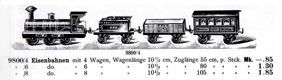 | Hess 300 series trains in 1901 Bing catalog Two listings in the Bing 1901 catalog for the Hess 300 series. One ad is for the locomotive with 4, 6, or 8 wagons. The other ad is for a 300 series locomotive only with “patent wheels” and flywheel.