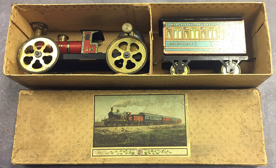 | Hess 575 loco with 300 series wagon, circa 1900 (not in my collection) During the early days of lithography and mass production, unusual combinations are to be seen. This boxed set contains a 575 series, big wheel, flywheel powered locomotive matched with a 300 series sleeping carriage. This 300 series sleeping carriage has not been observed before and definitely not with 575 locomotives. |