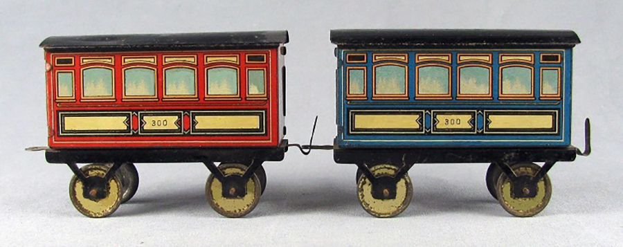 | Hess 300 series passenger coaches, circa 1900 w/o couplers: L 4.13” (10.5 cm), W 1.75” (4.5 cm), H 3” (7.6 cm) Passenger coaches for the Hess 300 series train. Both of these coaches are marked “300”. |