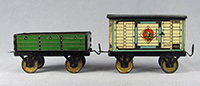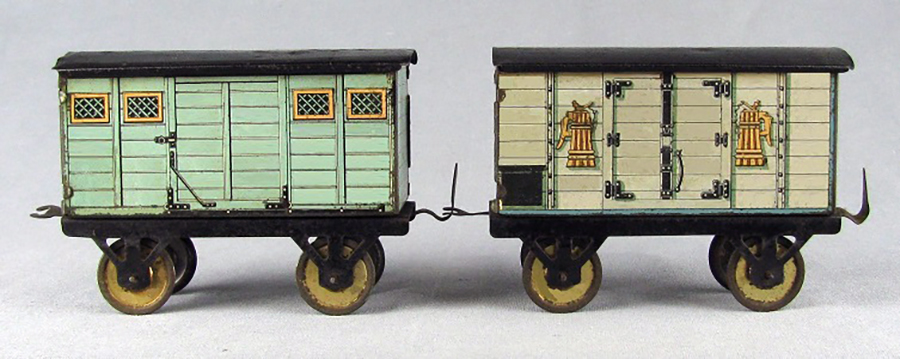 | Hess 300 series freight wagons, circa 1900 w/o couplers: L 4.125” (10.5 cm), W 1.75” (4.5 cm), H 3” (7.6 cm) Two goods wagons from the Hess 300 series. One wagon unmarked, the other is a reefer wagon decorated with beer steins. |