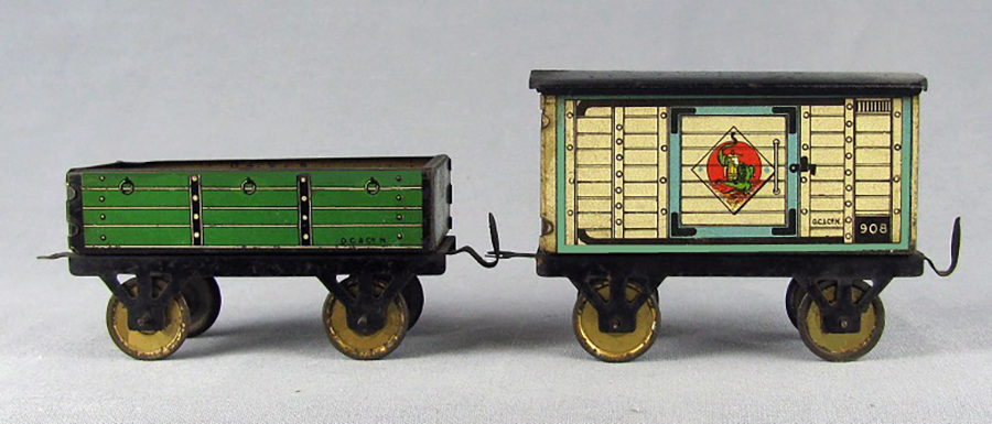 | Hess 300 series for Carette, circa 1900 w/o couplers: gondola; L 4.125” (10.5 cm), W 1.75” (4.5 cm), H 2.125” (5.4 cm) goods wagon; L 4.125” (10.5 cm), W 1.75” (4.5 cm), H 3” (7.6 cm) A gondola and goods wagon produced by Hess for Carette. Both of these pieces are marked “G.C.&Co.N.” and the goods wagon is also marked “908”. |