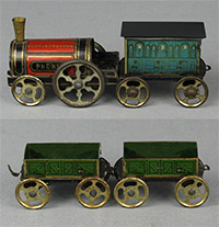 | Hess “Phonix” locomotive and rolling stock, circa 1890s Loco: L 3.9” (9.8 cm), W 2” (5.1 cm), H 3.1” (7.8 cm) Wagons: L 3.9” (8.6 cm), W 2” (5.1 cm) H 2.6” (6.9 cm) Locomotive is a windup with removable key, but I have observed simple push models of this locomotive, usually with the smaller size front wheels all around. Smaller wheels on loco and wagons are all marked “D. R. Patent”. The gondolas use the typical Hess fixed wheel to axle method, whereas the passenger wagon differs in that it uses a nail like axle crimped on one end to secure wheels in place. |