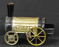 | Hess “Vulkan” clockwork locomotive, circa 1890 (not in my collection) Pictured is an early Hess “Vulkan” clockwork locomotive with an unusual mix of both cast wheels and stamped tinplate wheels. Later “Vulkan” locos used stamped tinplate on all wheels. Hess was an early innovator and patent holder for stamped tinplate wheels with fixed metal fastening and was known to make wheels as well as complete toys for other manufacturers. The only other mix of tinplate and cast wheels of which I am aware is the early 575 series windup locomotive. |