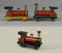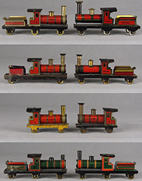 | Hess 100 series locomotive variations So much variation in both mechanics and graphics over the life of this little loco, a collector would be hard pressed to collect all of them. Here are a few variations in my collection, but always looking for additional pieces. Top left: circa 1920s production; top right: circa 1900 production made for Carette; Row two left: circa late 1890s production with only 2 sets of wheels and marked “M.H.”; Row three left: circa 1920s production without tender, marked “J.L.H.”, Row three right: circa late 1890s production without tender, marked “M.H.”; Row four left: circa 1930s production with “J.L.H.” logo; Row four right: circa 1920s production marked only with “100”. |