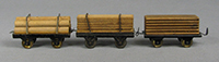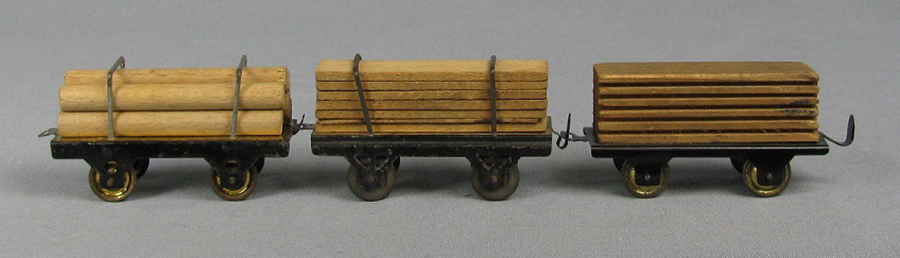 | Hess 575 series lumber wagon variations Over the life of the 575 series, 3 different lumber wagon styles were produced. Left: early version with soldered to frame retaining straps, round logs; Middle: Planks with soldered to frame retaining straps; Right: Single block of wood cut to simulate planks, nailed to frame.