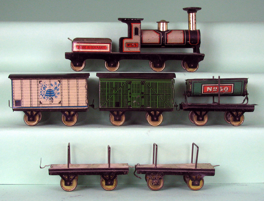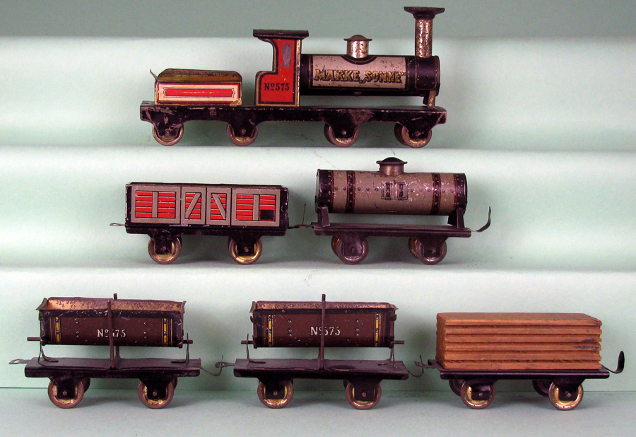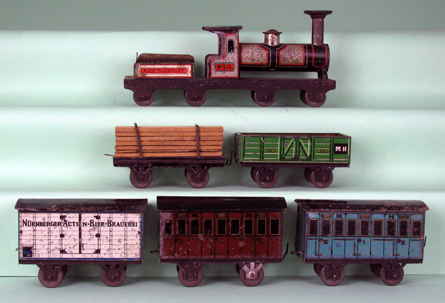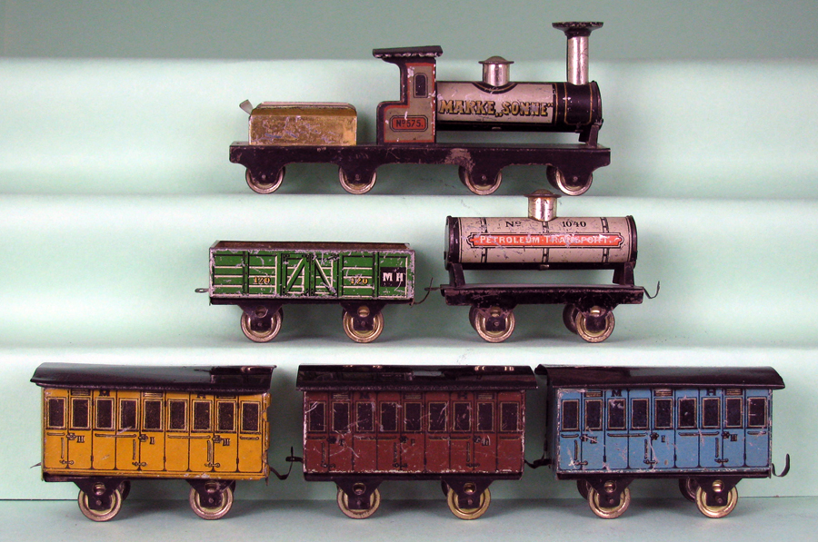 | Gray bodied Hess 575 series locomotive marked with “Marke Sonne”. Hess made many toys for other manufacturers as well as individual retailers. I think that this is probably for a French retailer who contracted with Hess. Loco appears to have had paper litho pasted onto tender (missing now). All passenger cars are marked with “M” and “H” (Matthias Hess). Petroleum tanker is marked with “1040”. | ||||