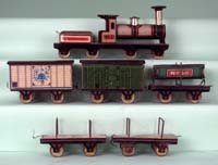 | Another gray bodied Hess 575 series locomotive with pasted paper litho on tender stating “Made in Germany”. Passenger cars and open gondola marked with “M” and “H”. Lumber wagon retaining strap soldered to frame. Noticeable is the difference in the wheel supports as they have additional cut-outs on this earlier model 575. Another item of interest with this set is the “Beer” goods wagon touting a Nuremberg made brew. | ||||