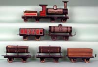 | The earliest 575 series loco that is in my collection. Gray bodied loco, paper litho pasted on tender and wheels that are fixed by lead rather than the three piece wheel set used on all later 575 locos. Unusual goods wagon with beehive printed on sides, lumber wagons (missing lumber) have metal retaining straps soldered onto frame. Later lumber cars simply had a nail through the bottom of the frame to hold lumber to car. Another unusual car is the number 50 tipping gondola. Later 575 series tipping gondolas were labeled “575”. | ||||