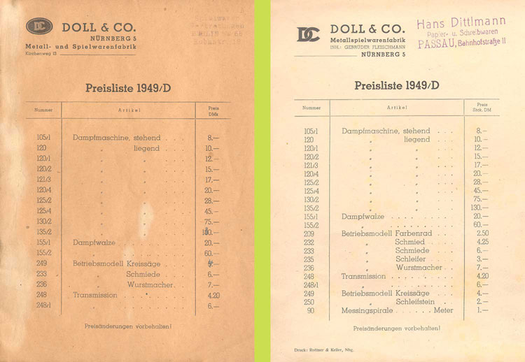 Von der Übernahme von Doll & Co durch Fleischmann ist schon viel geschrieben worden. Doll hatte bis zur Übernahme durch Fleischmann in 1938 ein riesiges Sortiment von Dampfmaschinen und Antriebsmodellen.