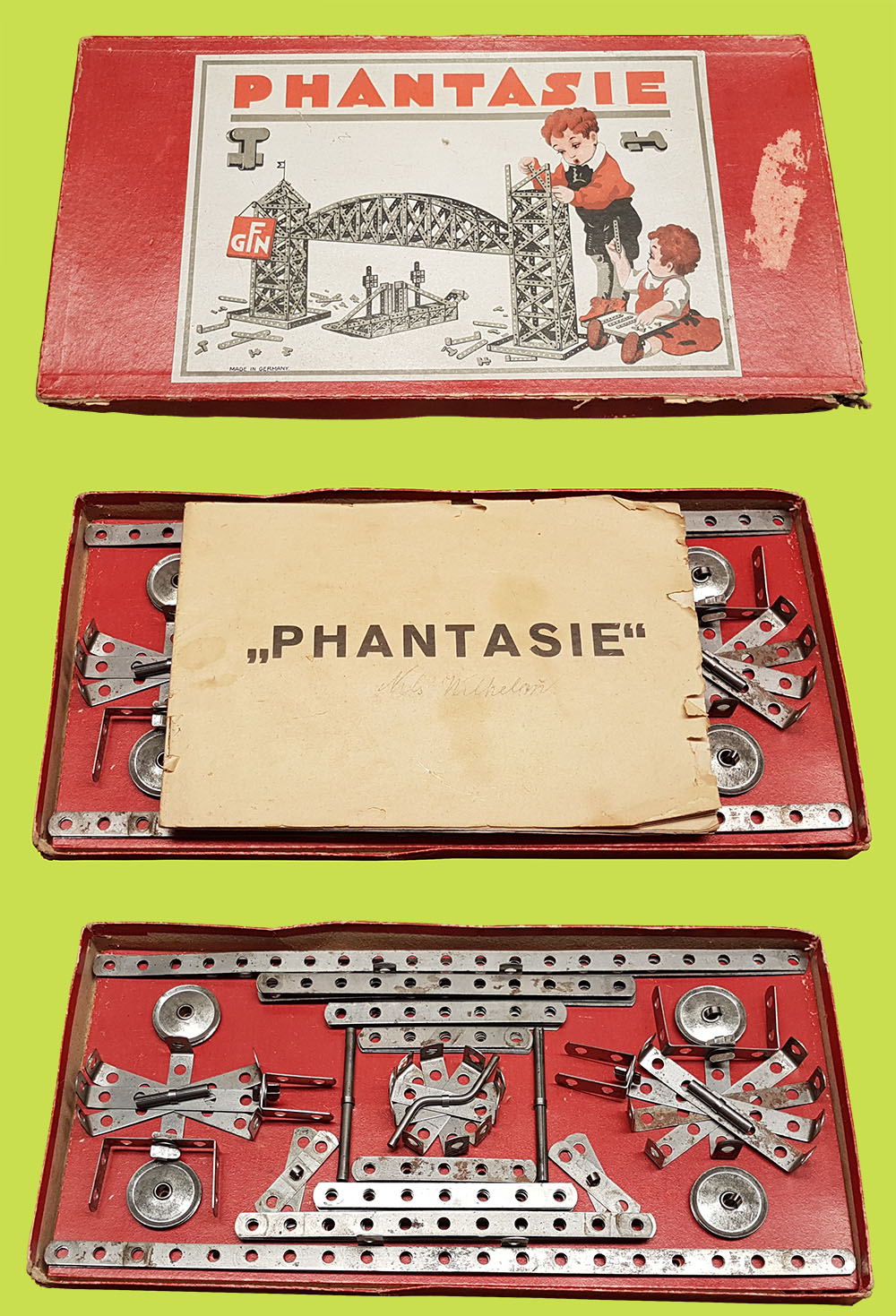 Ein Sammlerfreund aus Schweden hatte mich im Sommer 2016 auf unten abgebildeten Metallbaukasten gewiesen. Es handelt sich um einen Fleischmann Phantasie Baukasten II. In der Innenseite des Deckels wurde handschriftlich das Jahreszahl 1929 geschrieben. Fleischmann Baukasten? Sicher! Obwohl Man dafür weit ins Zeit zurück gehen muss, führten auch die Gebrüder Fleischmann aus Nürnberg Metallbaukasten ins Sortiment und zwar zwischen 1926 und 1936/39. Im Sommer 2015 habe ich schon ausführlich über diesen sogenannten Phantasie Baukasten geschrieben.