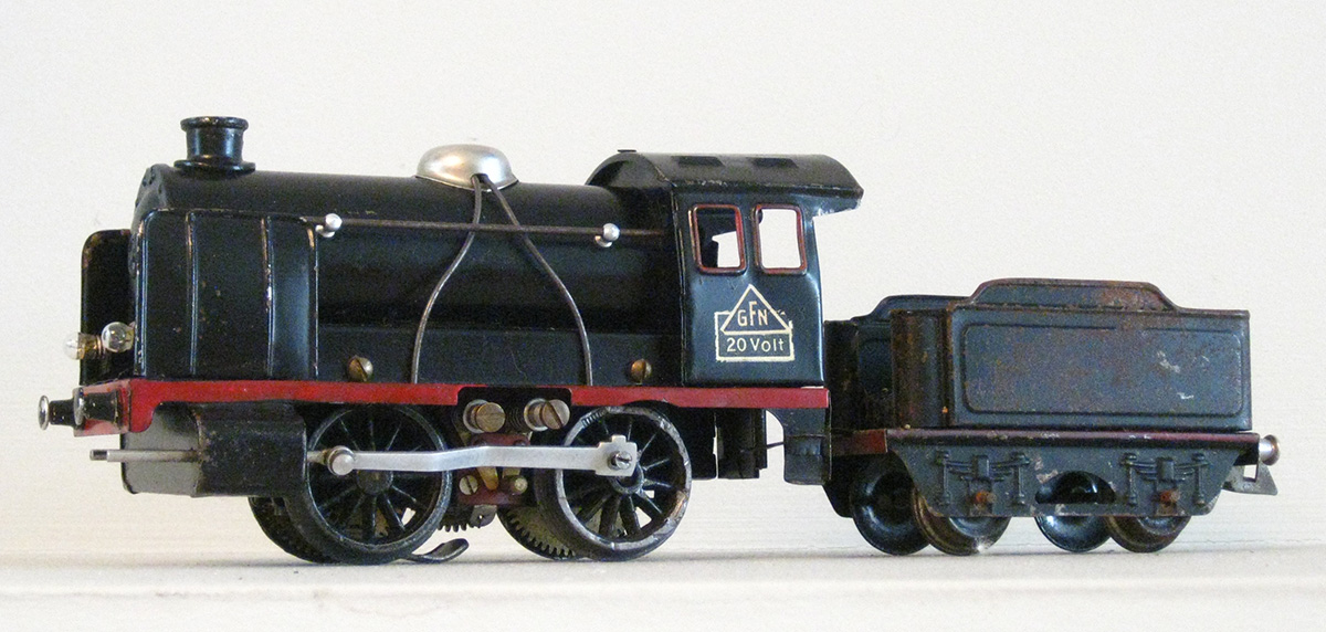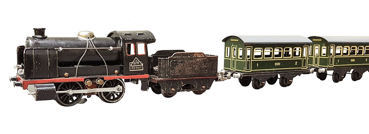 Am ersten Juli 1938 folgte die Übernahme von Doll & Co durch die Gebrüder Fleischmann. Beim oben abgebildeten Zug handelt es sich um Eisenbahn 4/505/110 (mit 2 Frontlampen auf der Pufferbohle). Der ähnliche Lok 4/702 hat nur eine Frontlampe in der Kesselfront. Die Personenwagen tragen nicht das erhabene DC Vignet, sonst die Aufmerkung made in Bavaria Laut dem 1987 Firmen Jubileumschrift läßt es sich nicht mehr ermitteln, ob im letzten Friendensjahr unter Fleischmanns Regie das komplette Eisenbahn Sortiment von Doll hergestellt und angeboten wurde oder ob man Straffungen vorgenommen hat. Umgezeichnet wurde offenbar nur eine Anzahl von kleinen zweiachsigen Schlepptenderlokomotiven, d.h. über deren rechteckigen Logo "DC - 20 Volt" mit dem dreieckigen GFN-Logo (Gebrüder Fleischmann Nürnberg) überklebt. Außerdem erhielt die Maschine neue Räder, die schon an die ab 1949 verwendeten erinnern. Ich habe 4 verschiedene Räder gesehen: 10 Speichen (rein Doll), 12 Speichen (Doll oder GFN?), 14 Speichen (Doll oder GFN?) und 16 (rein GFN). Diese Version ist recht selten. Man kann sie auch im Fleischmann-Museum in Schwabach bei Nürnberg sehen. Das Unternehmen begann bereits zum Jahreswechsel 1938/39 mit der Entwicklung eigener an Originalen orientierten Eisenbahnmodelle. Mit dem gesetzlich verordneten Stopp der Herstellung der Spielwaren aus Gründen der vom 2. Weltkrieg stark sanktionierten Wirtschaft endete die Spur-0-Fertigung von Doll. Allerdings nahm die Fleischmann-Tochter nach dem Krieg die Produktion der Dampfmaschinen und Antriebsmodelle erneut wieder auf. Die Herstellung von Dampfmaschinen wurde 1969 endgültig beendet. Fleischmann präsentierte 1949 als erstes Unternehmen eine Modelleisenbahn der Spur 0 nach einem Zweileiter-Gleichstrom-Prinzip. Modelleisenbahnen wurden bis zu diesem Datum mit verschiedenen Dreileiter-Systemen angetrieben. Aufgrund des überragenden Erfolgs der Spur H0, die seit 1952 einen Verkaufsrekord nach dem anderen aufstellte, wurde die Fertigung des Zweileiter-Gleichstrom-Systems der Spur 0 bereits 1959 wieder eingestellt. |