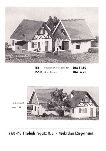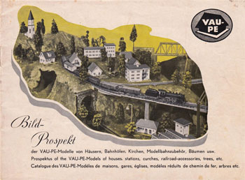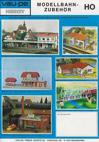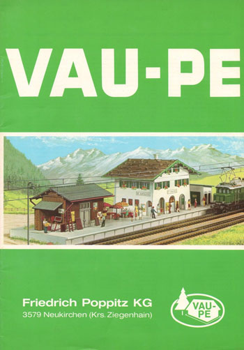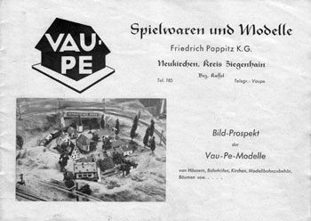 VAU-PE Modellspielwaren und Formenbau GmbH war ein Modelleisenbahn-Zubehör-Hersteller aus Wangen im Allgäu. Das Unternehmen wurde von Voigt („Vau“, Vorname unbekannt) und Friedrich Poppitz („Pe“) am 1. Juli 1950 gegründet und war erstmals 1951 auf der Spielwarenmesse mit 18 verschiedenen Baummodellen vertreten, die aus Drahtgeflecht mit ca. 15 festangestellten Mitarbeitern hergestellt wurden und sehr realitätsnah aussahen. Am 1. Juli 1952 wurde die Firma umgewandelt in die Vau-Pe Friedrich Poppitz KG (3579 Neukirchen Kr. Ziegenhain). In diesem Jahr wurde das Sortiment um Fertigmodell-Gebäude aus Holz, Pappe und Gips und um weiteres Modellbahnzubehör erweitert. 1958 baute das Unternehmen ein neues Firmengebäude und bezog es 1959. Zu diesem Zeitpunkt hatte das Unternehmen 10 festangestellte Mitarbeiter sowie 30 bis 40 Heimarbeiter. 1960 trat Horst Pollak von Pola an Vau-Pe heran, der wegen der hohen Einstiegskosten für eine neu aufzubauende Fertigung von Kunststoffbausätzen auf der Suche nach Mitinvestoren war. Fortan wurden die Kunststoffteile überwiegend bei Pola produziert und am Stammsitz verkaufsfertig konfektioniert. Einige Gussformen wurden in Bausätzen beider Firmen verwendet. Durch Geburtenrückgang und das Aufkommen der Computerspiele veränderte sich Anfang der 80er Jahre der Markt entscheidend. Vau-Pe als Familienbetrieb ohne Nachfolger beschloss 1985, die Produktion einzustellen, die Restbestände mit zwei Mitarbeitern verkaufsfertig aufzubearbeiten und dann die Firma zu schließen. Da der Produktionspartner Pola zu diesem Zeitpunkt durch den Tod des Geschäftsführers ebenfalls in Schwierigkeiten war, zeigte nur Eckhard Braun, früherer Mitarbeiter bei Noch, Interesse an einer Übernahme. Er kaufte Vau-Pe, verlegte den Unternehmenssitz nach Wangen im Allgäu und legte die Kunststoffbausätze in den Größen H0, TT, N noch einmal neu auf. Aktuell wird nicht mehr produziert. Mit gleicher Adresse und Telefonnummer erschien später die Firma ARWE-Modelltechnik Christel Braun e. K. Die letzte bekannte Adresse war der Webereiweg 1, 88239 Wangen im Allgäu. |