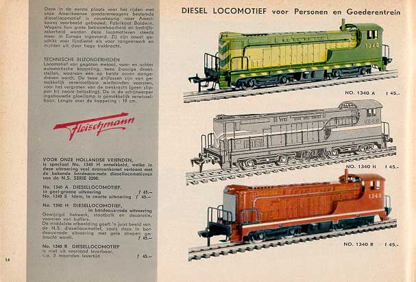 Seite 14 des 1958/59 H0 Kataloges, holländische Ausgabe, mit eine Abbildung in sw/w von dem 1340H aus den 1340 Serie. Der 1340H ist heute der seltesten Lok aus dem 1340 Serie. | |